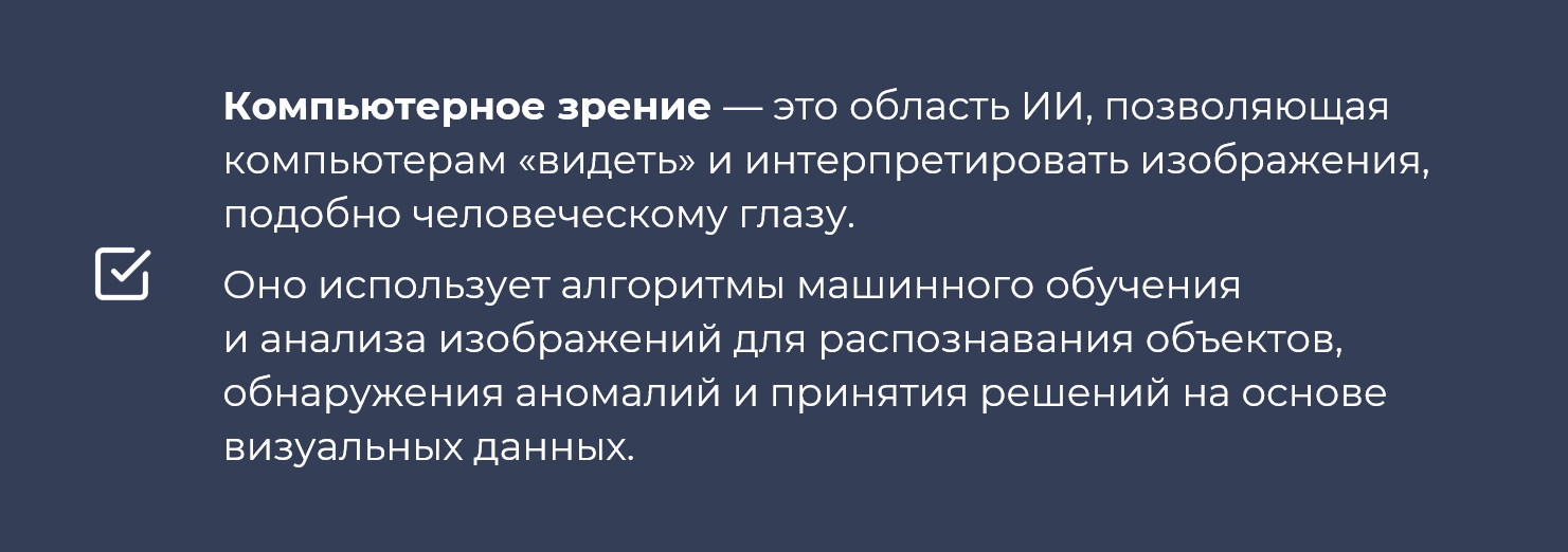 Современные системы мониторинга на базе технологий компьютерного зрения обеспечивают непрерывный анализ производственной обстановки, мгновенно определяя наличие у работников средств индивидуальной защиты (далее — СИЗ), контролируя соблюдение границ опасных зон, правильность выполнения технологических операций с точки зрения безопасности и так далее.
